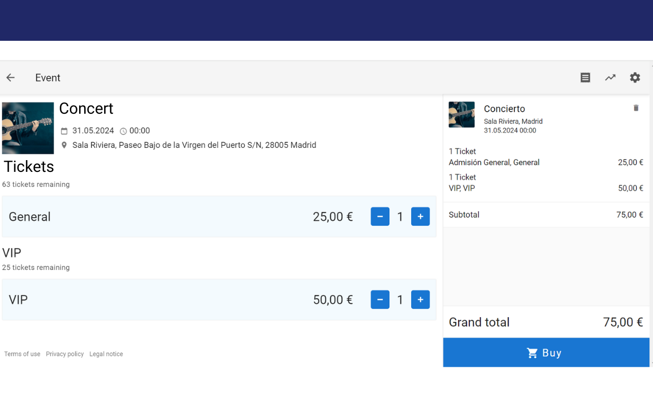 The box office is a web application within EVENTIM.Light that allows you to sell tickets at a physical point. This way, you have the option to use your office for pre-sales or you can use it to sell tickets at the box office on the day of the event.