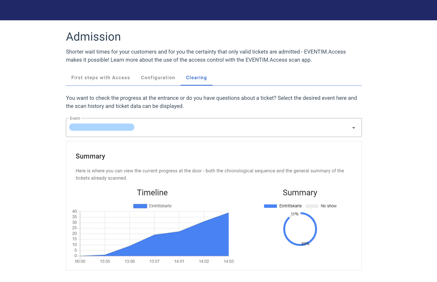 Always keep an exact overview of the admission process. The scan app shows you directly how many tickets have already been scanned. The reporting in your EVENTIM.Light account also gives you a detailed insight into the admission process. For example, you can see at what time the rush was particularly high, how many people are already there and which ticket categories were scanned how often. With the help of this data, you can improve the process on site or optimise admission for future events.