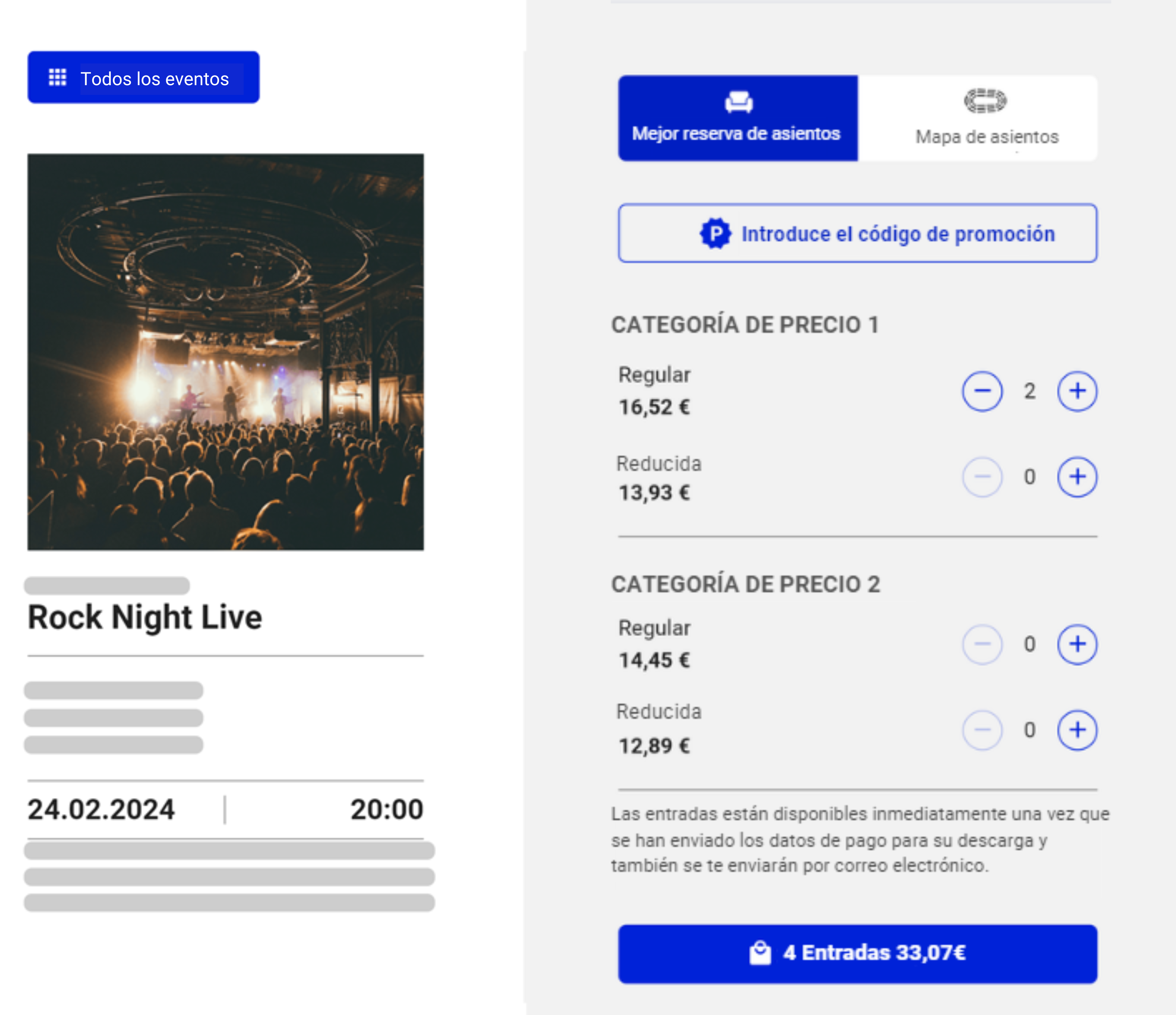 La venta de entradas es una parte importante de la gestión de tu evento. Elige una solución tan fácil como eficiente. EVENTIM.Light te permite crear tu propia tienda online para vender entradas de conciertos e integrarla en tu propio sitio web en solo unos clics. Con todas las funciones de EVENTIM.Light podrás definir fácilmente diferentes categorías de precios y zonas.