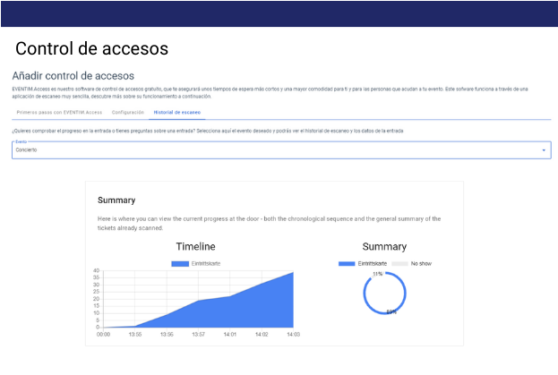 Ten el control en todo momento del proceso de admisión de tu evento. La aplicación te mostrará cuantas entradas se han escaneado ya y cuantos clientes no han accedido todavía. Los informes en tu cuenta de EVENTIM.Light también te ofrecen una visión detallada del proceso de admisión. Podrás ver a qué hora hubo más aforo, cuántas personas han accedido ya y que categorías de entradas se han escaneado con mayor frecuencia. Con esta información puedes mejorar el proceso de admisión y optimizar este para futuros eventos.