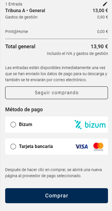 El check-out simplificado hace que el proceso de compra sea especialmente cómodo gracias a los métodos de pago como Bizum y tarjeta de crédito. Después de su compra, tus clientes recibirán una entrada digital imprimible como archivo PDF vía e-mail o también descargándola directamente desde la página de confirmación y añadirla a Google o Apple Wallet.