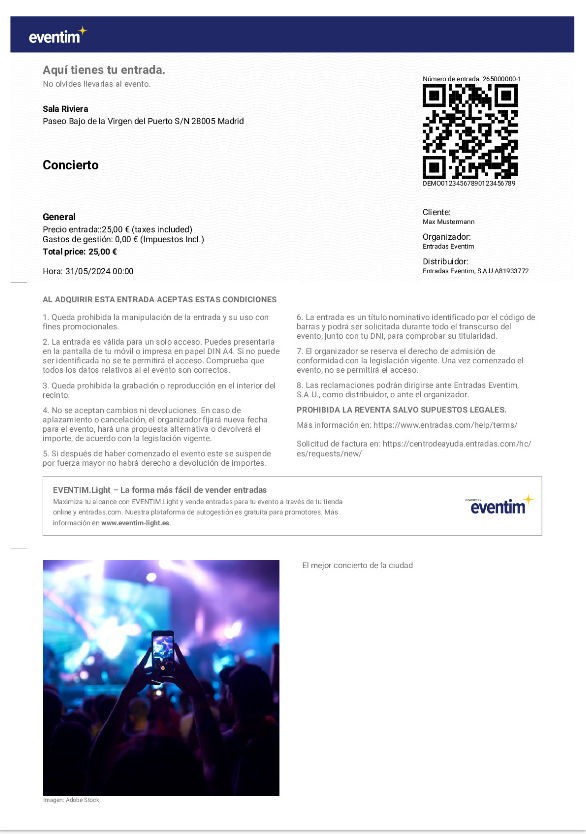 Personaliza fácilmente el diseño de tus entradas en PDF añadiendo tus propias imágenes o textos. Puede ser una imagen de tu evento, tu logo o de tus patrocinadores. Un mensaje personal adicional o consejos útiles para tus clientes harán que tu evento sea toda una experiencia.