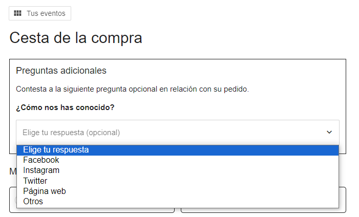 Utiliza preguntas adicionales en el proceso de compra para conocer mejor las necesidades de tus clientes y optimizar así su oferta. Puedes añadir una pregunta adicional relacionada con el pedido que aparecerá a todos los compradores. También podrás añadir preguntas relacionada con un evento específico.